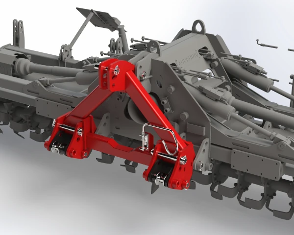 The extended three-point linkage is an essential component when using twin front wheels, as it prevents interference between the twin front wheels and the tractor wheels by ensuring proper spacing. Crucial for setups with a shaper mounted on a parallelogram, it ensures full range of movement and precise adjustment of working depth.